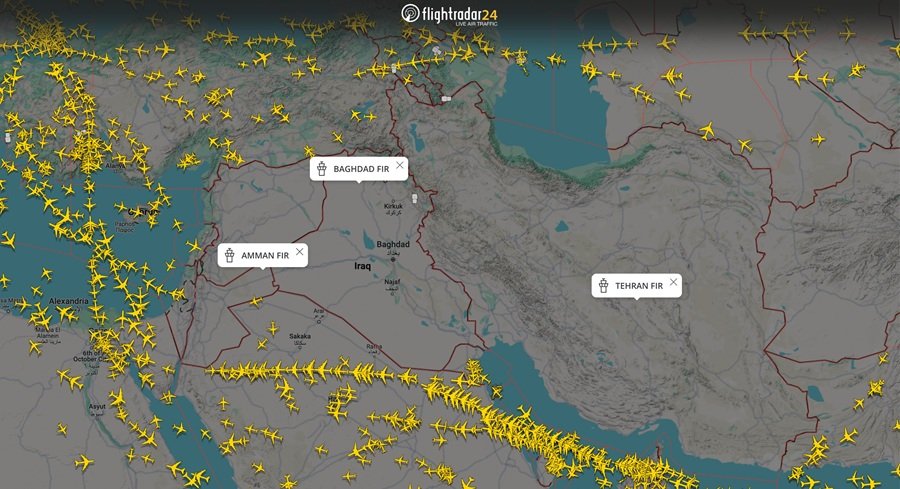 اس وقت تہران سے کئی ایرانی طیارے روانہ ہو رہے ہیں۔ کال سائنز سے ظاہر ہوتا ہے کہ یہ شیڈول کے مطابق پروازیں نہیں ہیں، اس لیے ممکن ہے کہ یہ طیارے محفوظ ہوائی اڈوں کی طرف منتقل ہو رہے ہوں۔